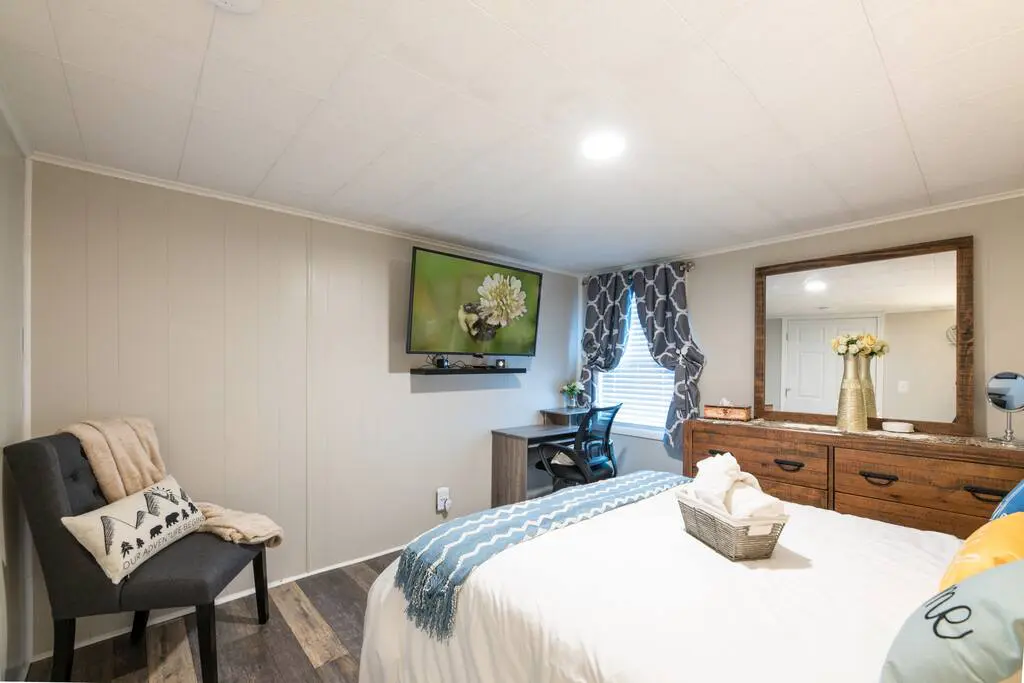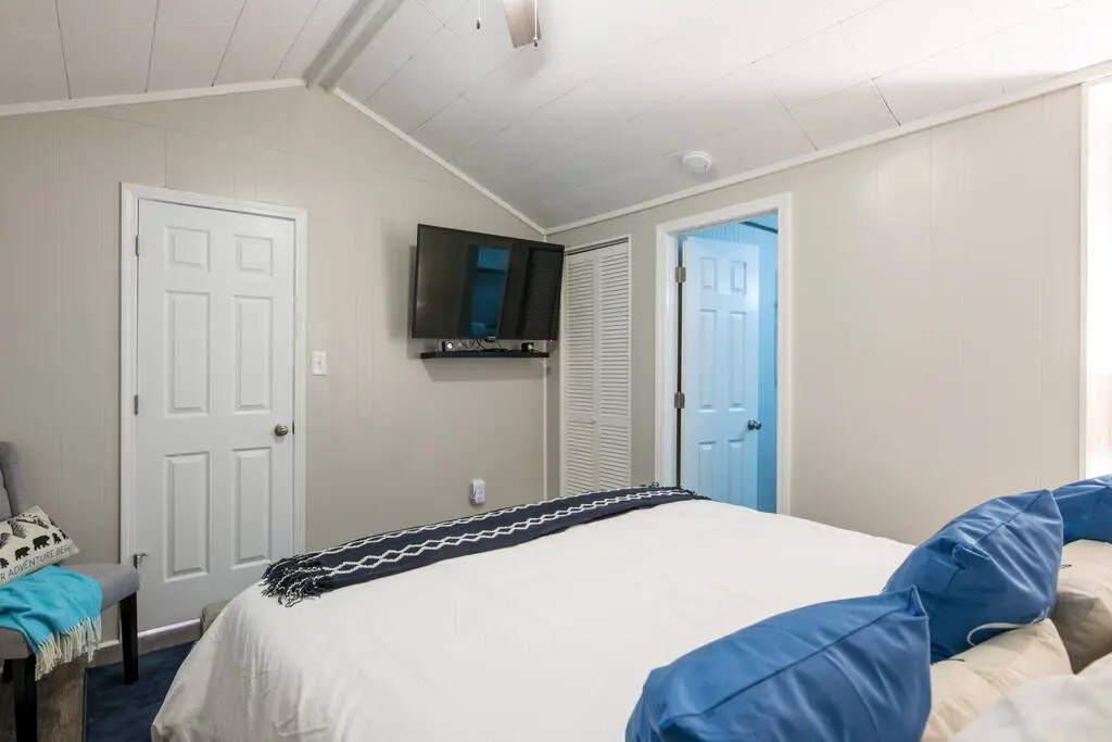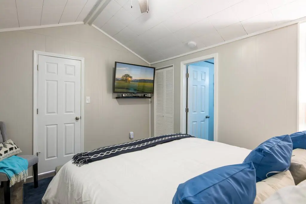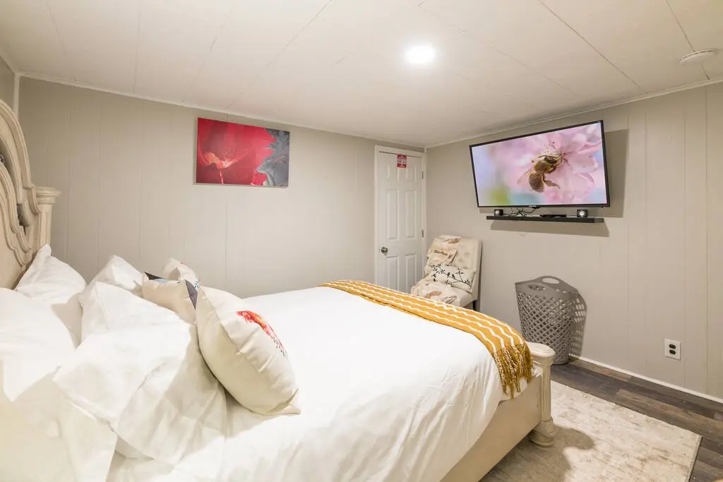 The master bedroom offers plush comfort with a king-size bed and a generous Netflix-equipped television.